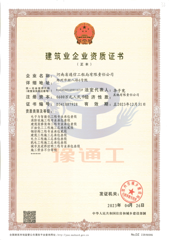 电子与智能化、建筑装修装饰、消防设施工程专业承包壹级;钢结构工程专业承包贰级;建筑工程、电力工程、机电工程、城市及道路照明工程专业施工总承包叁级;施工劳务不分等级。